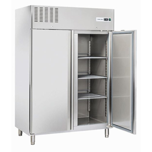 Zamrzovalna omara RN 1390 je v celoti narejena iz inoxa. Opremljena je z zračnim hlajenjem, avtomatskim odtajevanjem in digitalnim termostatom. Debelina izolacije je 75 mm. Odstranljiva tesnila. Led osvetlitev. Vrata se lahko nastavi po želji – levo ali desno odpiranje. Vrata se zapirajo sama in s tem se prepreči odvečno uhajanje hladnega zraka. Vključena ključavnica. Šest nastavljivih polic GN2/1. Nastavljive nogice.