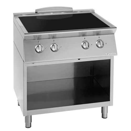 Električni indukcijski štedilnik s štirimi grelnimi conami. V celoti narejen iz inoxa. Zaradi ustvarjanja toplote v stiku s posodo se zmanjša čas kuhanja. Majhna poraba energije. Enostavno čiščenje. Nastavljive nogice po višini.