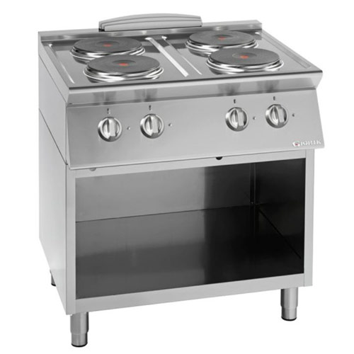 Električni štedilnik s štirimi okroglimi kuhalnimi ploščami moči 2,6 kW. V celoti narejen iz inoxa. Nastavljive nogice po višini.