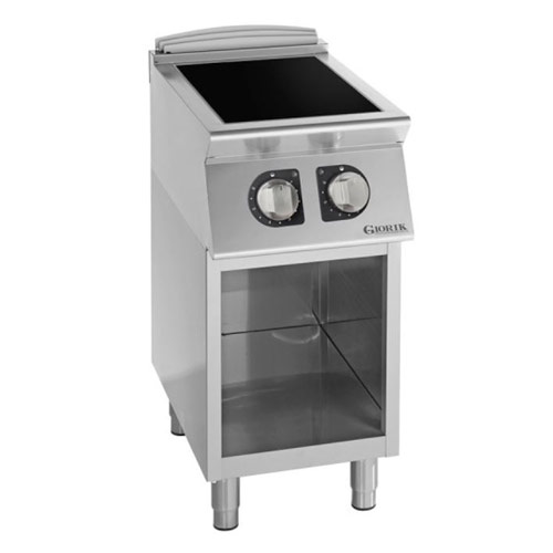 Električni steklokeramični  štedilnik z dvema ločenima kuhinjskima conama moči 2,1 kW. V celoti narejen iz inoxa. Nastavljive nogice po višini.
