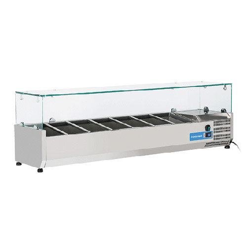 Namizna hladilna vitrina VRX 15/33 je v celoti narejena iz inoxa. Ima stekleno zaščito. Primerna je za 7 x GN1/4 posode. Opremljena je s statičnim hlajenjem in digitalnim termostatom. Nastavljive nogice. GN posode niso vključene.