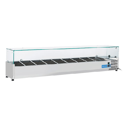 Namizna hladilna vitrina VRX 20/33 je v celoti narejena iz inoxa. Ima stekleno zaščito. Primerna je za 10 x GN1/4 posode. Opremljena je s statičnim hlajenjem in digitalnim termostatom. Nastavljive nogice. GN posode niso vključene.