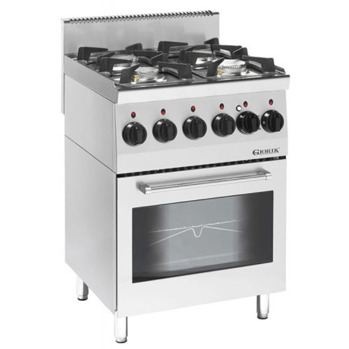 Plinski štedilnik s štirimi litoželeznimi gorilniki, dimenzij 2 x 3,5 kW, 2 x 6 kW in plinsko konvekcijsko pečico. V celoti narejen iz inoxa. Trojno zastekljena vrata za preprečevanje uhajanja toplote. Enostavno čiščenje. Nastavljive nogice po višini.