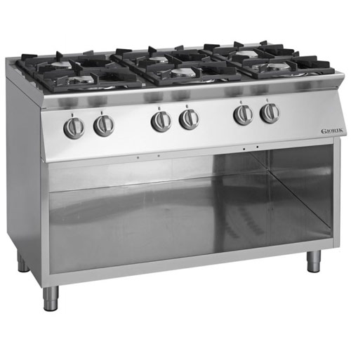 Plinski štedilnik s šestimi plinskimi gorilniki, dimenzij 3 x 4 kW in 3 x 8 kW. V celoti narejen iz inoxa.