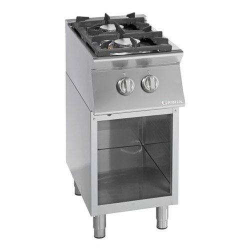 Plinski štedilnik z dvema plinskima gorilnikoma, dimenzij 1 x 4 kW in 1 x 8 kW. V celoti narejen iz inoxa. Nastavljiva delovna površina od 850 mm do 900 mm.