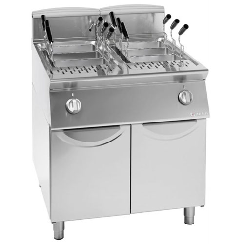 Plinski kuhalnik testenin z dvema 26 litrskim bazenoma, je narejen iz inoxa. Okoli bazena je rob, kar omogoča lažjo postavitev košar in preprečuje odvečno kapljanje vode. Rezervoar se napolni s pomočjo pipe, izprazni pa na dnu bazena. Po višini nastavljive nogice.
