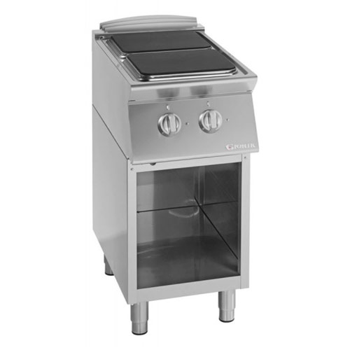 Električni štedilnik z dvema električnima kuhalnima ploščama moči 4 kW in velikosti 300 x 300 mm. V celoti narejen iz inoxa. Nastavljive nogice po višini.