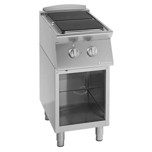 Električni štedilnik z dvema kuhalnima ploščama moči 2,6 kW. V celoti narejen iz inoxa. Nastavljive nogice po višini.